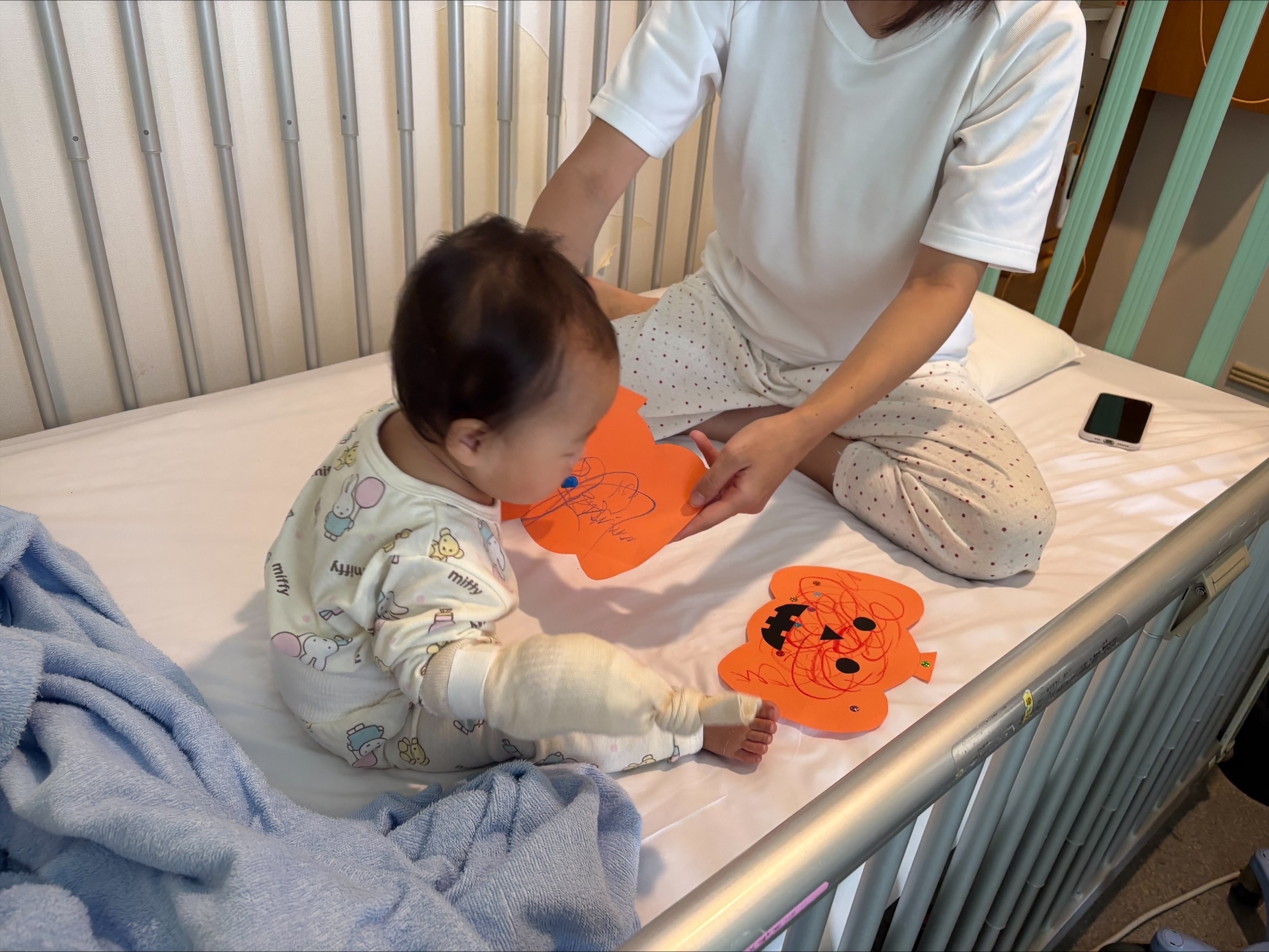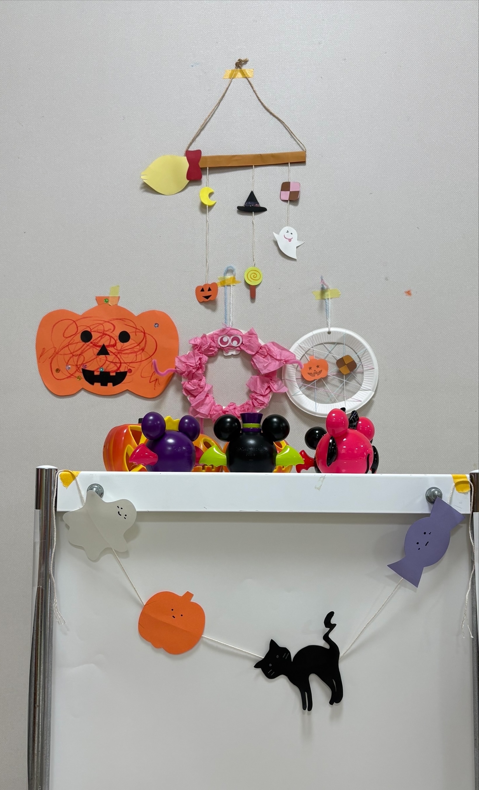 10月31日はハロウィンですね。小児病棟では医師も仮装をして病棟全体で盛り上げています。保育士は、10月29日から10月31日にかけて年齢別にクモの巣リース作りとモンスター作り、カボチャ作りのハロウィン製作、ガーランドをプレゼントしました。