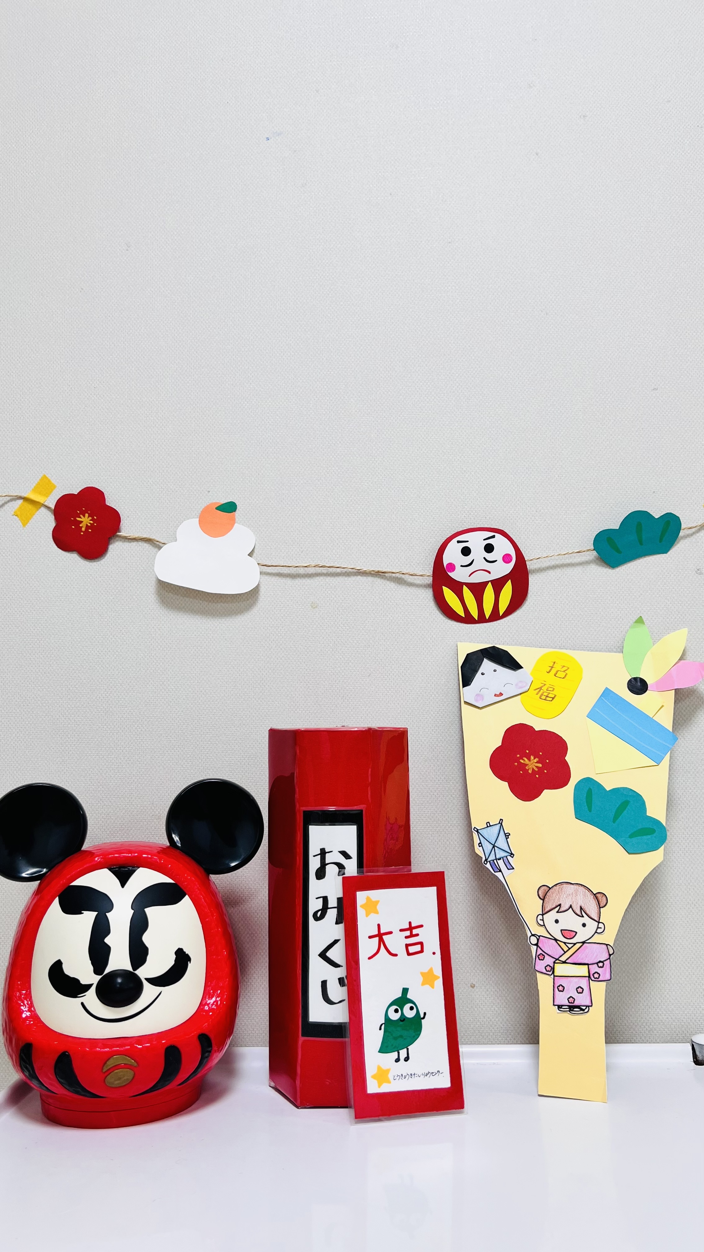 あけましておめでとうございます。小児病棟ではお正月行事を行いました。新生児にはガーランドのプレゼント、乳幼児は羽子板製作、学童児には掛け軸製作を行ってもらいました。掛け軸製作では今年頑張りたいことや目標を書いてもらいました。Kくんは「何書いたらいいの?」と悩みながらもお母様と以前話されていたという目標を書かれ、素敵な掛け軸を完成させていました。また、製作後におみくじを引いてもらうと見事に大吉が出て、「やったー!!」と喜んでいる姿が印象的でした。