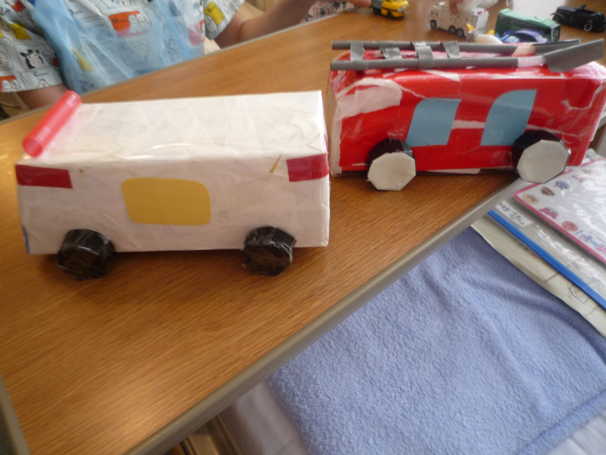 車がだいすきなAくん。トミカで遊ぶことが多く、大きな画用紙に街を描き、たくさん車を走らせることにしました。Aくんにどんな街にしたいか聞くと、「ラーメン屋さんがあって、、、あとコーラが買える自動販売機がほしい。駐車場も欲しい!」と描きたいものがたくさんある様子。その後一緒に描きトミカでたくさん遊びました。何日か経ち自分で消防自動車、救急車を牛乳パックで作ることにしました。消防自動車のハシゴはストローで作り動かせるようになっています。病室に来るスタッフに「みてみて!作ったよ!」と大きな声で教えてくれるAくんでした。