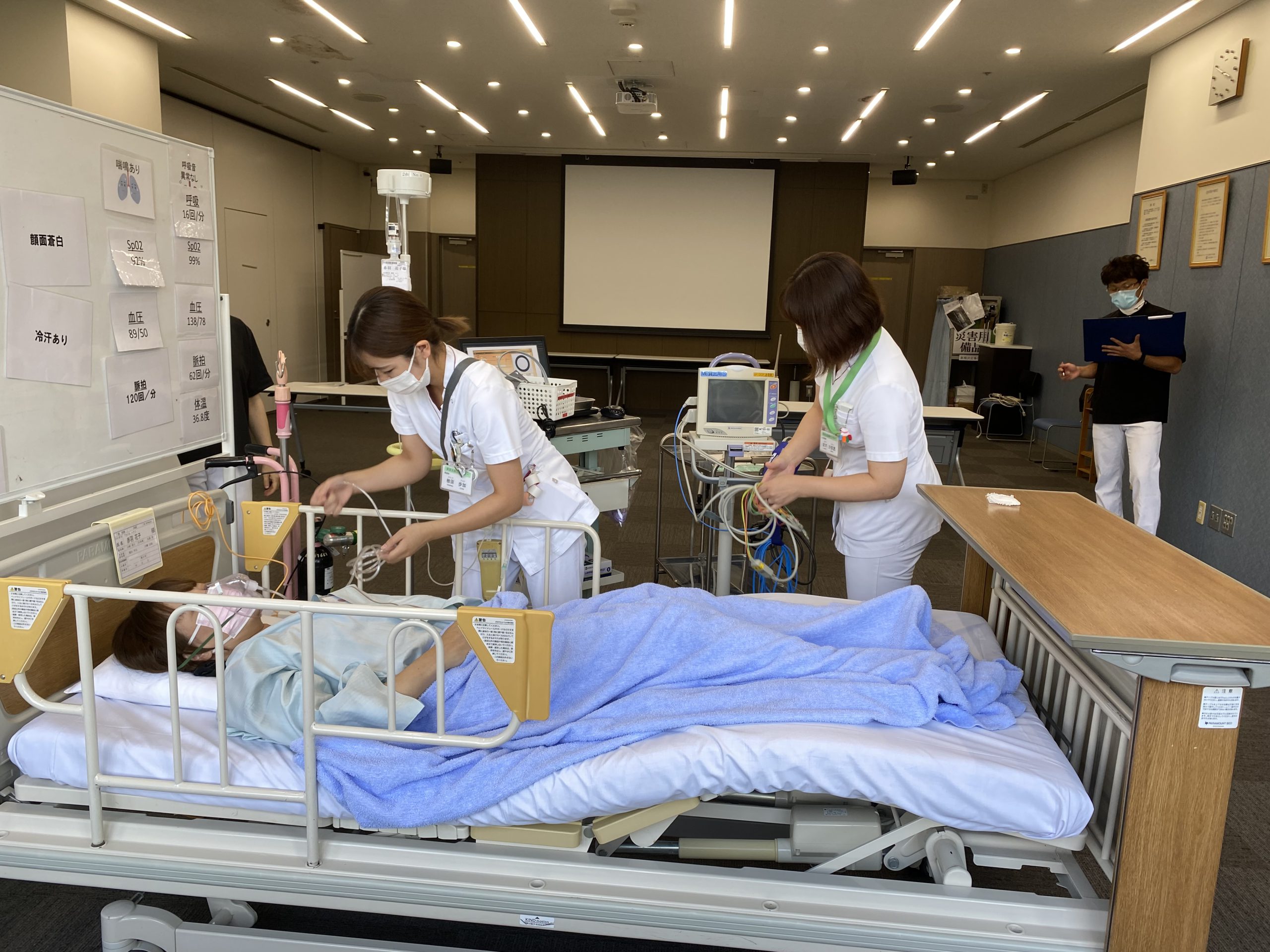 プレレベル1研修ではシミュレーション研修を行いました。テーマは「気づく力を高めよう!」目の前で患者の急変に遭遇した場合に応援の仕方、緊急コールでの対応の仕方、自分でできることは何かを考え行動することを目的とした研修です。一人が行ったシミュレーションをグループで振り返りよかった点、改善点を話し合い次のシミュレーションへ生かしていきます。最終的には急変が起きた時の患者の対応、患者への声掛け、先輩看護師への状況報告、緊急コールの必要性などいっぱい学ぶことができました。シミュレーション時は緊張で頭が真っ白!ドキドキしながらも自分でできる精いっぱいの対応ができるように最後まで頑張っていました。研修後は緊張が解けてニコニコ笑顔(*^-^*)同期とも久しぶりに会えて、みんなも頑張っているんだなと感じましたね。「すっごく緊張したけれど勉強になりました」「やってよかった」「緊急時人を集めるために緊急コールをすることの大切さを感じた」などなど・・。シミュレーション研修で学んだ「気づく力☆彡」みんなの今後の看護の力になる!!