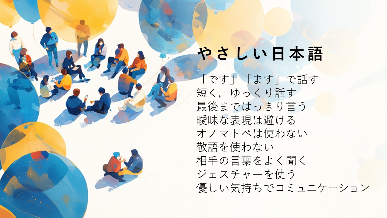 こちらが相手へのリスペクトで敬語を使っていても,実はそれが理解しやすい言葉とは限りません.「やさしい日本語」は日本語を母語としない方、高齢者、障がいのある方などとのコミュニケーションで理解を助けるものです.